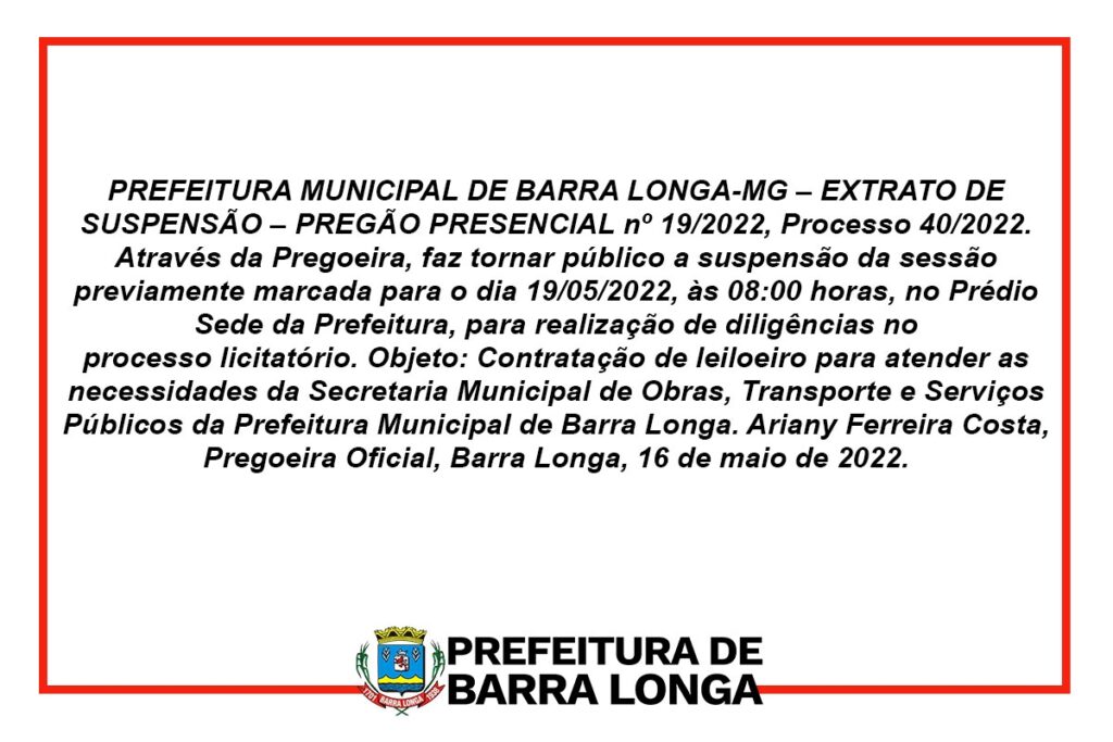 Extrato de Suspensão – Processo nº 040/2022 – Pregão Presencial nº 019/2022