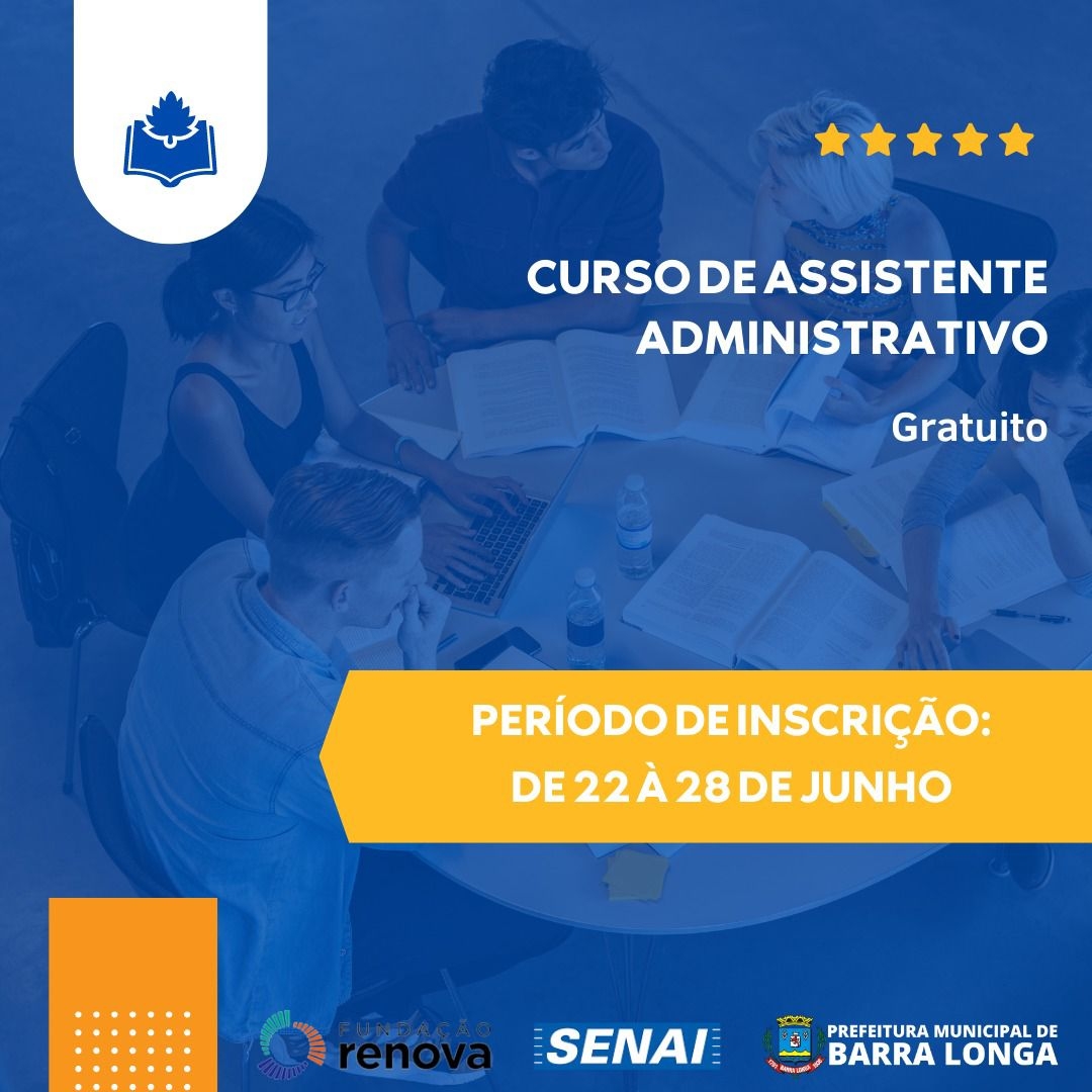 A Prefeitura Municipal de Barra Longa, através da Secretaria Municipal de Assistência Social e Habitação, em parceria com o SENAI Ponte Nova e a Fundação Renova, está com inscrições abertas para o curso de capacitação de Assistente Administrativo, que será realizado na Escola Estadual Padre José Epifânio Gonçalves.