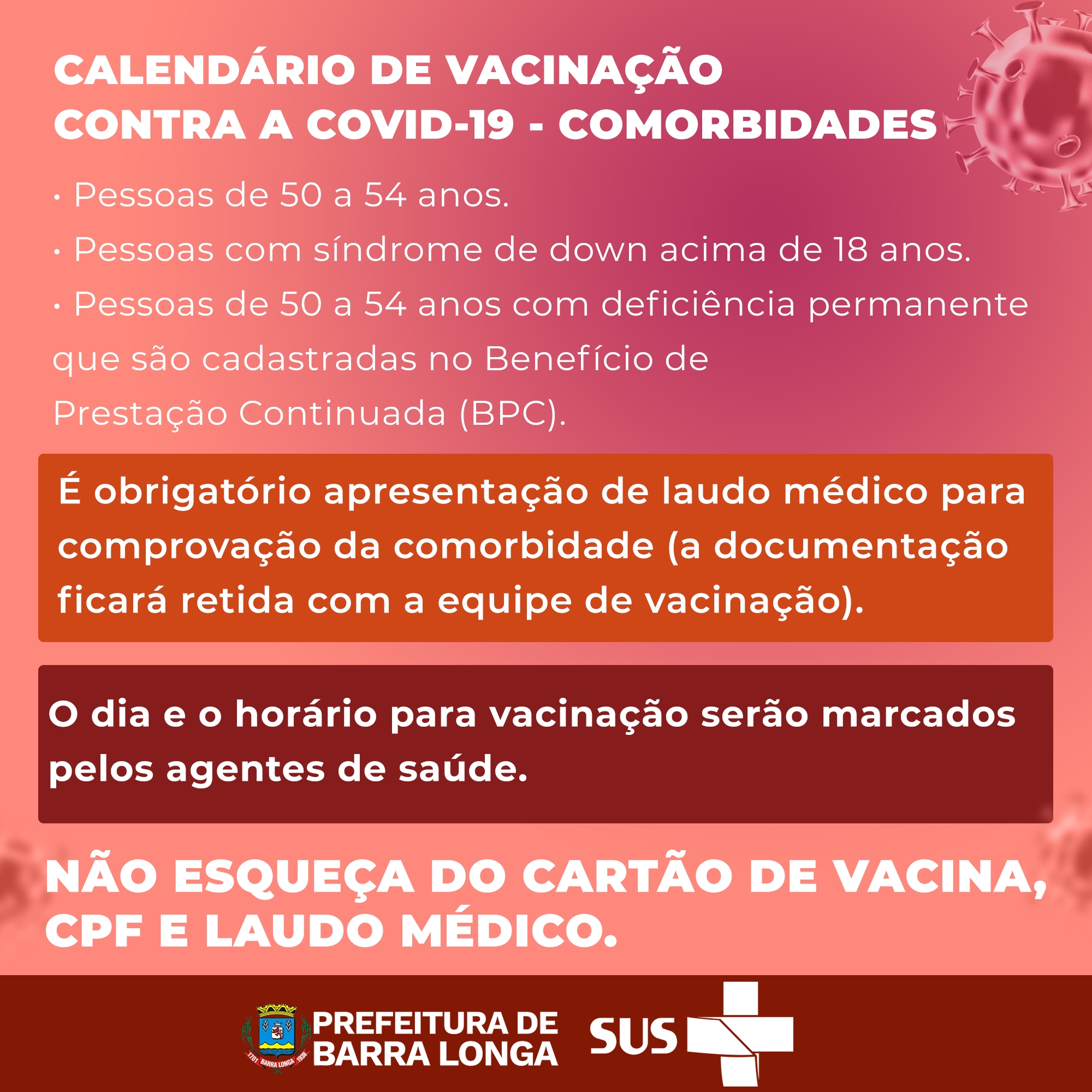 Está aberto o calendário para vacinação contra a Covid-19 para pessoas de 50 a 54 anos com comorbidades, pessoas com síndrome de down acima de 18 anos e pessoas de 50 a 54 anos com deficiência permanente que são cadastradas no Benefício de Prestação Continuada (BPC).