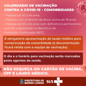 Está aberto o calendário para vacinação contra a Covid-19 para pessoas de 50 a 54 anos com comorbidades, pessoas com síndrome de down acima de 18 anos e pessoas de 50 a 54 anos com deficiência permanente que são cadastradas no Benefício de Prestação Continuada (BPC).