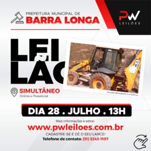 A Prefeitura Municipal de Barra Longa realizará no dia 28 de julho, às 13h00, um leilão de itens que não tem mais utilidade para o município, entre: mobiliários em geral, sucatas de informática, veículos, máquinas, entre outros. São veículos, maquinários e mobiliários sem condição de uso para a administração municipal