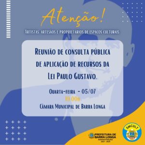 A Prefeitura Municipal de Barra Longa, por meio da Secretaria de Cultura e Turismo, convida os artistas, artesãos e proprietários de espaços culturais do Município para a consulta pública de aplicação de recursos da Lei Paulo Gustavo. A reunião será realizada no dia 05 de julho, as 19:00, na Câmara