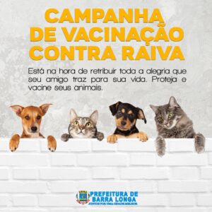 A Prefeitura Municipal de Barra Longa, por meio da Secretaria Municipal de Saúde iniciou ontem (05/08), a Campanha de Vacinação Antirrábica para Cães e Gatos. A imunização será feita de casa em casa por profissionais da SMS na Zona Urbana e Rural. A campanha tem como meta imunizar o maior