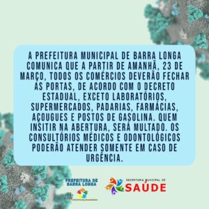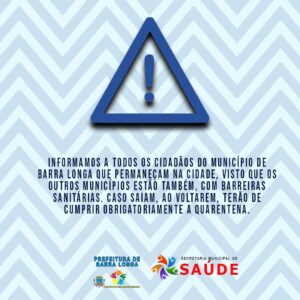 Informamos a todos os cidadãos do município de Barra Longa que permaneçam na cidade, visto que os outros municípios estão também, com barreiras sanitárias. Caso saiam, ao voltarem, terão de cumprir obrigatoriamente a quarentena.