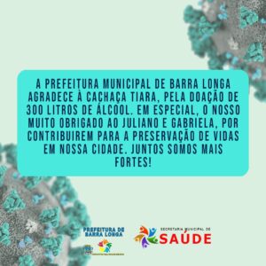 O Departamento Municipal de Assistência Social de Barra Longa, distribuiu hoje (25), álcool 70%, às famílias carentes. O Município de Barra Longa agradece ao Mel Milagres e Gerson do Carmo, pela doação das embalagens para a distribuição do álcool.