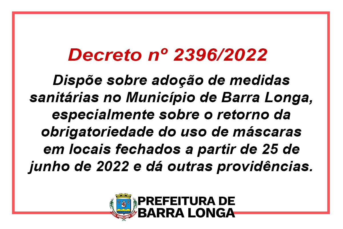 Dispõe sobre adoção de medidas sanitárias no Município de Barra Longa, especialmente sobre o retorno da obrigatoriedade do uso de máscaras em locais fechados a partir de 25 de junho de 2022 e dá outras providências.