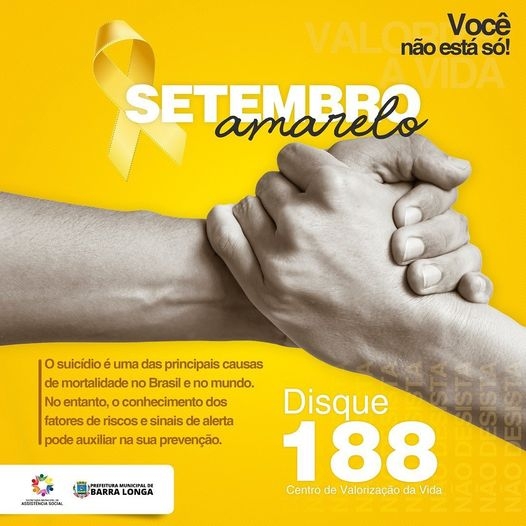 Dando visibilidade à campanha do Setembro Amarelo, a Prefeitura Municipal de Barra Longa, vem conscientizar os munícipes em relação aos cuidados e a prevenção ao suicídio e a depressão. É de extrema importância a prática da empatia com o próximo, e o cuidado com a saúde mental. Vale ressaltar que a prevenção ao suicídio e aos quadros depressivos deve ser praticada e tratada durante todo o ano.
